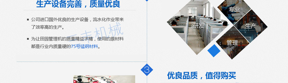 公司堅持綠色環保、智能制造的目標定位,大力弘揚工匠精神,微耕機 以具有豐富實踐經驗的高級工程師為主體的技術管理隊伍。